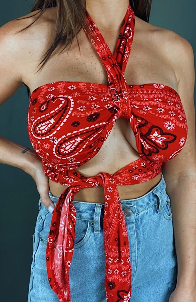 So, why not transform your bandana into a pretty crop top or wear a cute bandana design top? This trend has been seen numerous times, not just with a bandana but also with a scarf, and it always looks fantastic in my opinion.