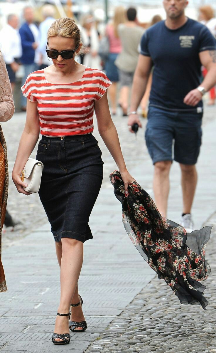 Kylie Minogue looked sporty, wearing a red and white striped top with a black jeans skirt. The 54-year-old singer and songstress paired her style with black strappy heels and completed the style with black oversize sunglasses.