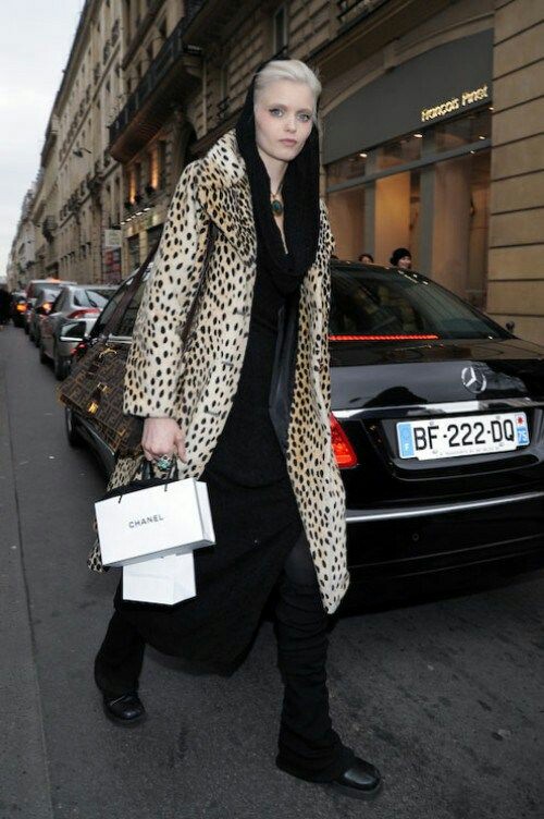 The model, Abbey Lee, looked pretty in a leopard-printed overcoat. She paired her style with a black split dress and matched it with ankle boots, and completed the style with a white mini Chanel purse.