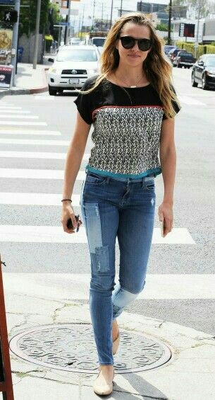 #9. Australia street style: Teresa Palmer in blue skinny-tight patchwork jeans with printed t-shirt and nude pointed-toe sneakers